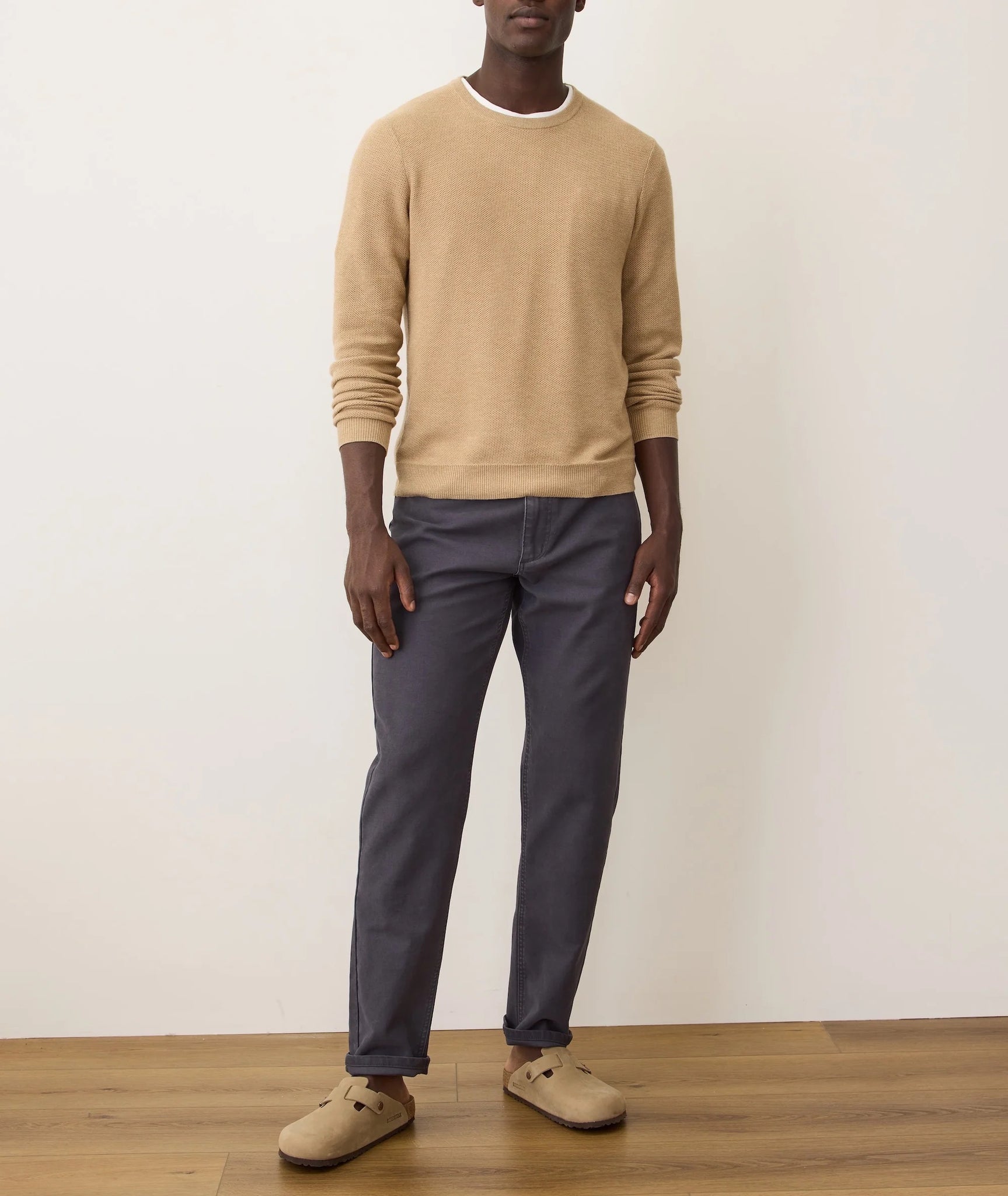 Marine Layer's sweater tees are made with a super soft blend of cotton for softness, wool for warmth, and nylon to help them keep their shape. Lightweight enough to wear while it's still warm, and just warm enough to beat a breeze.
