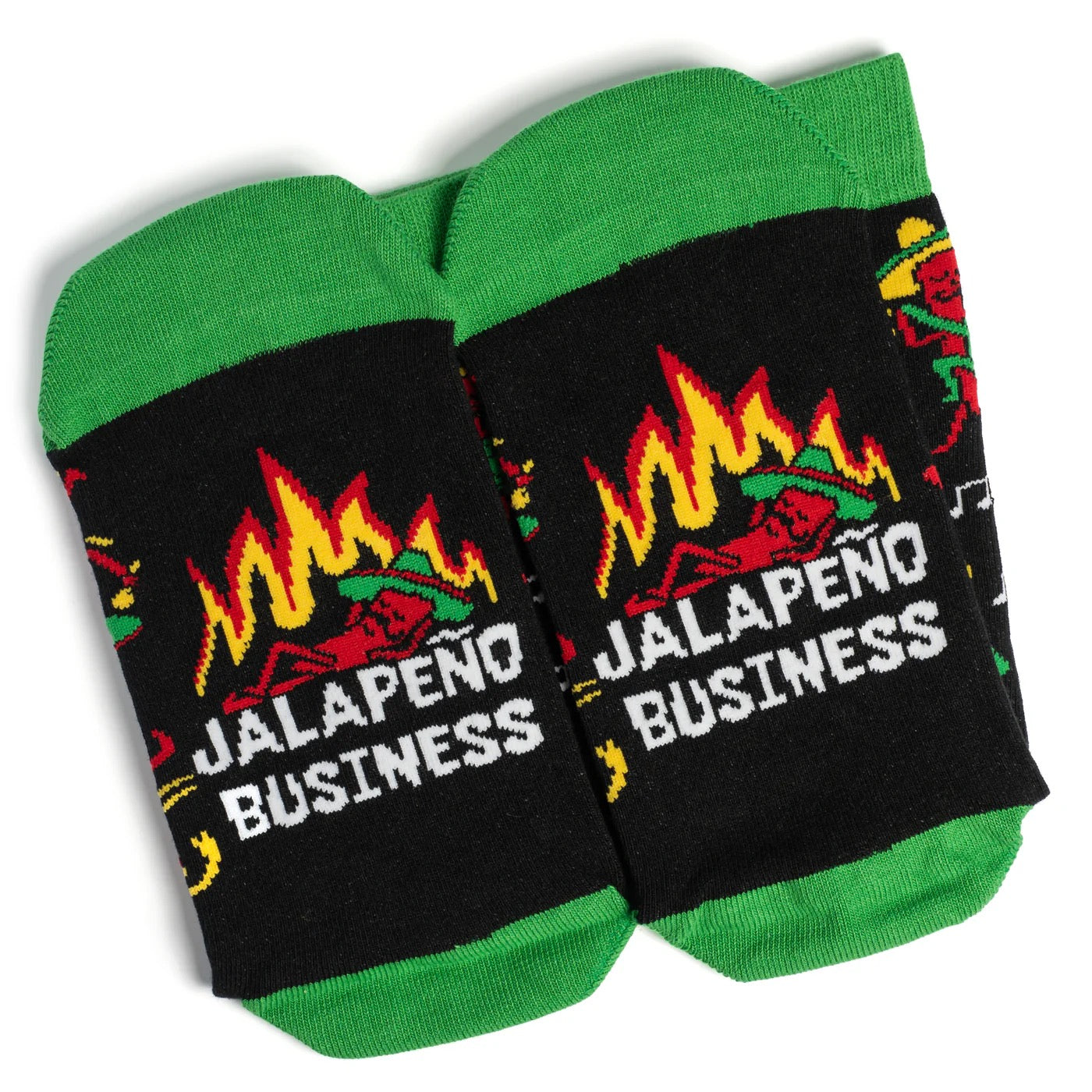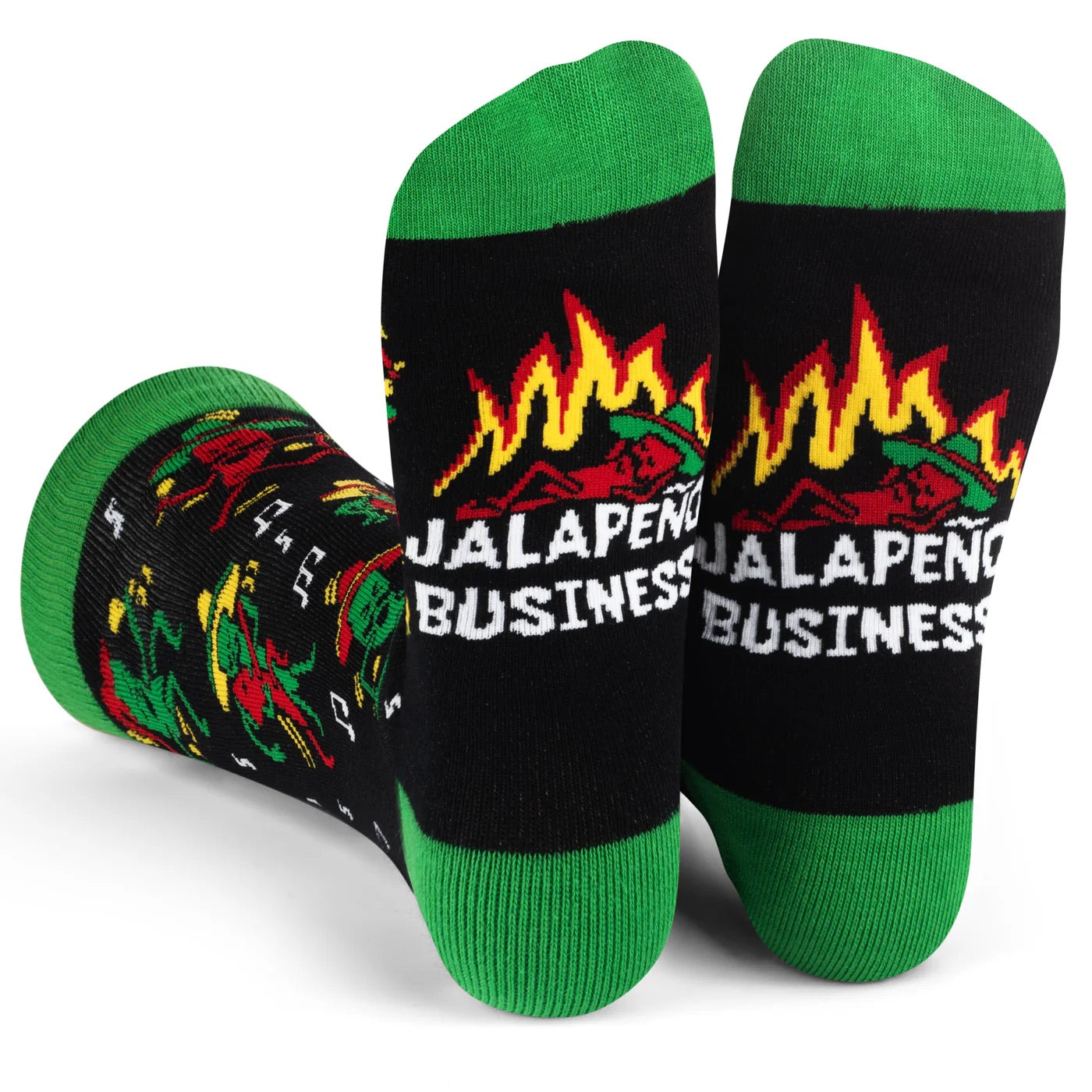 Add some sizzling flavor to your style and dance the night away with our “Jalapeno Business” socks! The playful design features red and green pepper people donning sombreros and moving to the salsa beat. Get fired up in comfort with these zesty cotton blend socks that will feel like a fiesta for your feet. These jalapeño socks are a hot gift idea for your partner or anyone who likes to spice it up!