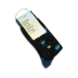 Party people, this pair is for you! Turn every step into a dance move with these dazzling disco ball socks. • Each pair donates $1 to support The Trevor Project’s life-saving hotline for LGBTQ youth. • Small fits women’s US shoe sizes 5-9, men's US shoe sizes 4-8, and EU shoe sizes 36-40. • Medium fits women’s US shoe sizes 9.5-14, men's US shoe sizes 8.5-13, and EU shoe sizes 41-47. • Sustainable • Certified Organic • Certified Fairtrade • Certified Vegan • Members of 1% for the Planet