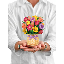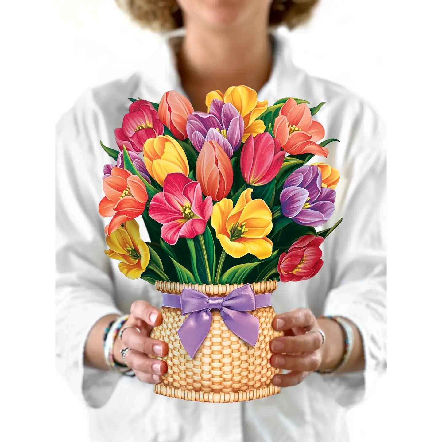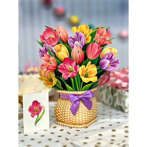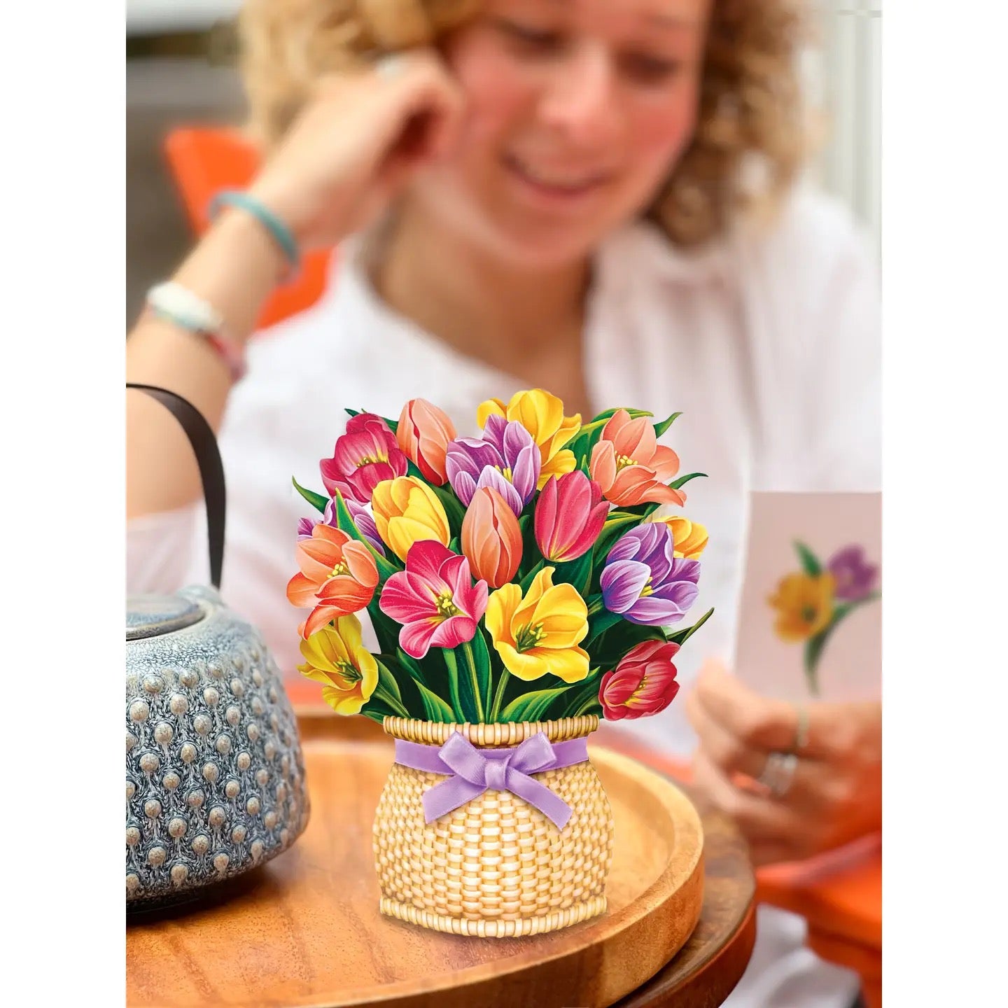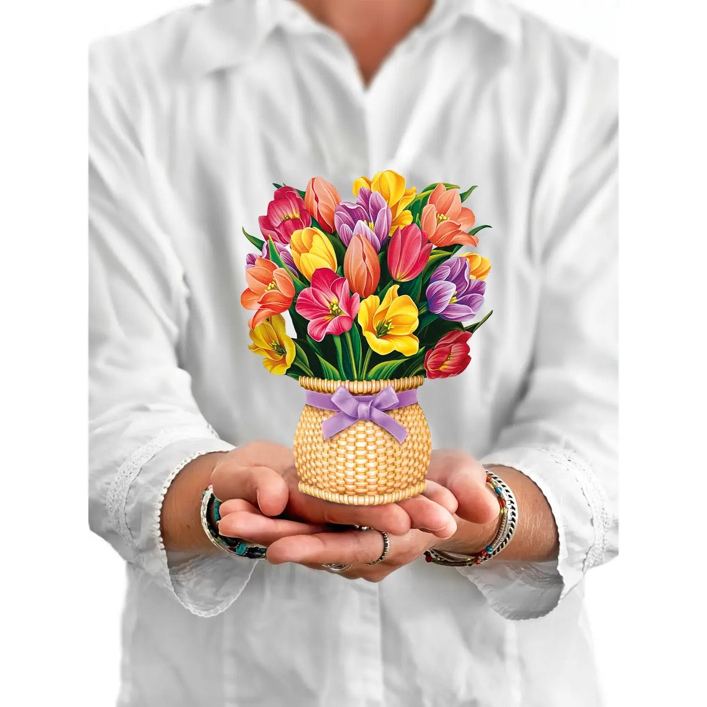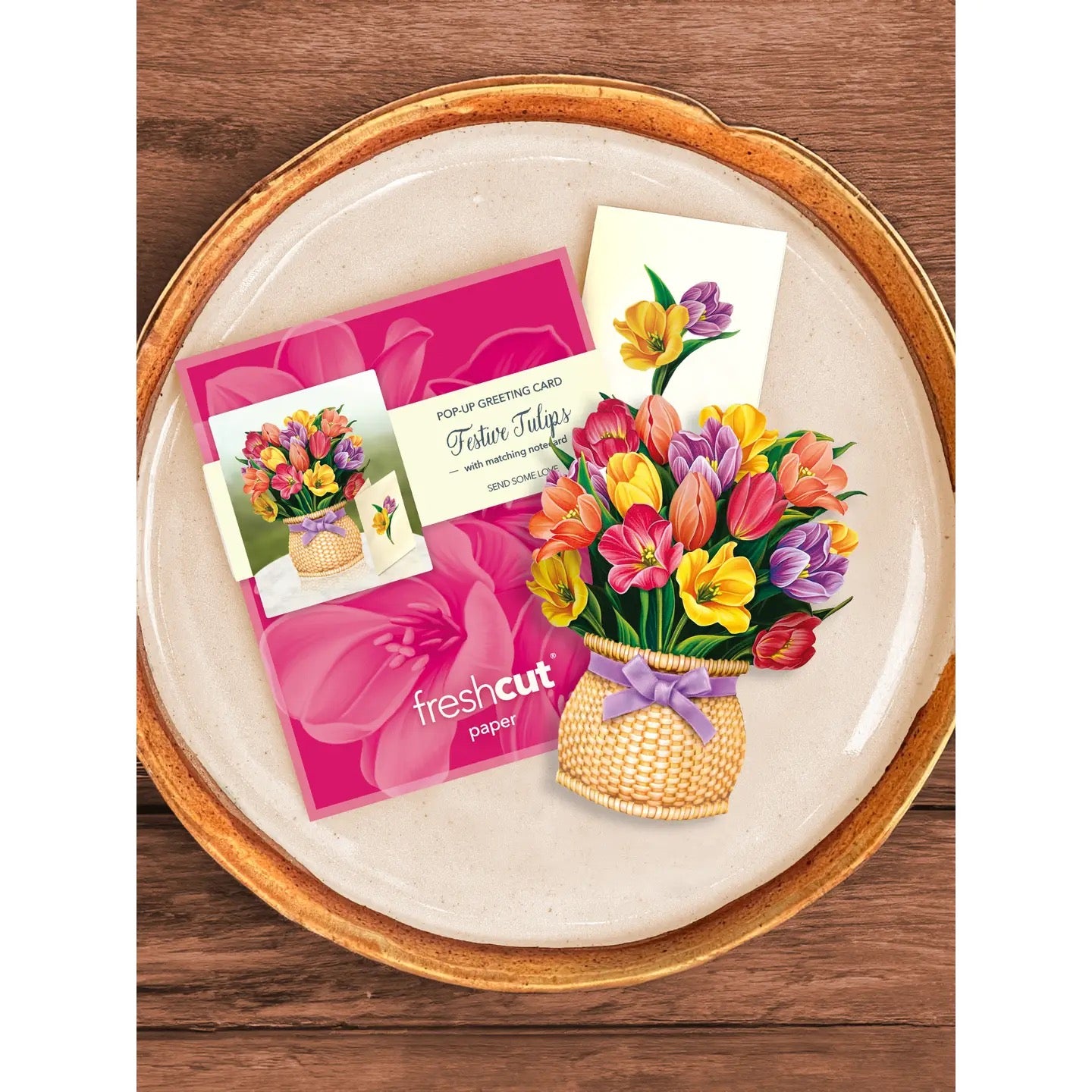 SMALL: Mini Festive Tulips (Flowers with envelope +notecard). Each pop up flower card includes a small blank coordinating notecard. The muse of many Dutch artists now blooms in a marvelously mini size. FreshCut Paper’s Mini Festive Tulips Bouquet features a dazzling collection of sustainable, vibrant blooms that radiate the essence of spring long after the season ends.