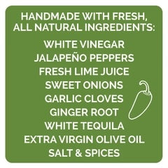 INGREDIENTS: White vinegar, jalapeño peppers, lime juice, sweet onions, garlic cloves, ginger root, white tequila, extra virgin olive oil, salt & spices.