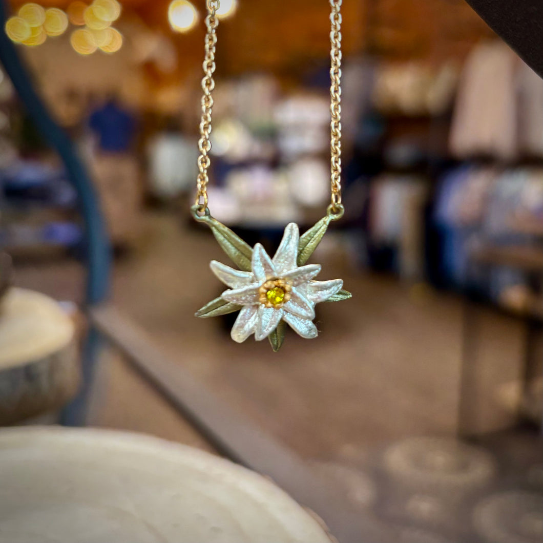 {"id":7217018667111,"title":"Michael Michaud Edelweiss Pendant Necklace","handle":"michael-michaud-edelweiss-pendant","description":"\u003cp\u003e \u003c\/p\u003e\n\u003cp\u003eMake this Edelweiss Pendant part of your jewelry collection! This beautiful necklace has a little touch of shimmer, and it's handcrafted in the USA.\u003cmeta charset=\"utf-8\"\u003e\u003c\/p\u003e\n\u003cp\u003e\u003cstrong\u003eMeasures:\u003c\/strong\u003e\u003cspan\u003e Chain: 16\" - 18\" L (adjustable)\u003c\/span\u003e\u003c\/p\u003e\n\u003cp\u003e\u003cspan style=\"text-decoration: underline;\"\u003e\u003cstrong\u003eAbout Michael Michaud Jewelry\u003c\/strong\u003e\u003c\/span\u003e\u003cbr\u003eThe Michael Michaud Jewelry Collection, designed by Michael Michaud, is a world renowned collection of botanical jewelry. It captures the beauty and exquisite detail of nature using soft patinas on bronze accented with pearls, beads, coral and stones. His exacting attention to detail gives you true to nature, botanical jewelry.\u003cbr\u003e\u003c\/p\u003e\n\u003cp\u003eThis unique jewelry is made by creating molds directly from botanical elements in a process similar to lost-wax casting. While traditional lost-wax casting begins with a hand-carved model of wax, Michael Michaud instead uses an actual leaf, branch or flower in place of the wax model. A mold is created around the botanical element and as it is heated the plant matter burns away and leaves behind a beautifully detailed mold of itself.\u003c\/p\u003e\n\u003cp\u003eMichael Michaud Jewelry is renowned for its beauty and workmanship and is featured in the finest museums, galleries and speciality retailers around the world. Many collections are commissioned by leading museums such as The Victoria \u0026amp; Albert Museum, The Art Institute of Chicago, The National Gallery of Art and the Château de Versailles.\u003c\/p\u003e\n\u003cp\u003eEach piece of Michael Michaud Jewelry is handcrafted in New York, U.S.A.\u003c\/p\u003e","published_at":"2025-02-20T16:13:51-06:00","created_at":"2025-02-20T16:07:51-06:00","vendor":"Michael Michaud","type":"necklaces","tags":["Jewelry","Necklaces"],"price":7700,"price_min":7700,"price_max":7700,"available":true,"price_varies":false,"compare_at_price":null,"compare_at_price_min":0,"compare_at_price_max":0,"compare_at_price_varies":false,"variants":[{"id":41226118791271,"title":"Default Title","option1":"Default Title","option2":null,"option3":null,"sku":"9557BZ","requires_shipping":true,"taxable":true,"featured_image":null,"available":true,"name":"Michael Michaud Edelweiss Pendant Necklace","public_title":null,"options":["Default Title"],"price":7700,"weight":142,"compare_at_price":null,"inventory_management":"shopify","barcode":"95572970","requires_selling_plan":false,"selling_plan_allocations":[]}],"images":["\/\/indieindiebangbang.com\/cdn\/shop\/files\/IMG_3176.jpg?v=1740089629"],"featured_image":"\/\/indieindiebangbang.com\/cdn\/shop\/files\/IMG_3176.jpg?v=1740089629","options":["Title"],"media":[{"alt":"Michael Michaud Edelweiss Pendant - Indie Indie Bang! Bang!","id":26111158354023,"position":1,"preview_image":{"aspect_ratio":1.0,"height":3393,"width":3393,"src":"\/\/indieindiebangbang.com\/cdn\/shop\/files\/IMG_3176.jpg?v=1740089629"},"aspect_ratio":1.0,"height":3393,"media_type":"image","src":"\/\/indieindiebangbang.com\/cdn\/shop\/files\/IMG_3176.jpg?v=1740089629","width":3393}],"requires_selling_plan":false,"selling_plan_groups":[],"content":"\u003cp\u003e \u003c\/p\u003e\n\u003cp\u003eMake this Edelweiss Pendant part of your jewelry collection! This beautiful necklace has a little touch of shimmer, and it's handcrafted in the USA.\u003cmeta charset=\"utf-8\"\u003e\u003c\/p\u003e\n\u003cp\u003e\u003cstrong\u003eMeasures:\u003c\/strong\u003e\u003cspan\u003e Chain: 16\" - 18\" L (adjustable)\u003c\/span\u003e\u003c\/p\u003e\n\u003cp\u003e\u003cspan style=\"text-decoration: underline;\"\u003e\u003cstrong\u003eAbout Michael Michaud Jewelry\u003c\/strong\u003e\u003c\/span\u003e\u003cbr\u003eThe Michael Michaud Jewelry Collection, designed by Michael Michaud, is a world renowned collection of botanical jewelry. It captures the beauty and exquisite detail of nature using soft patinas on bronze accented with pearls, beads, coral and stones. His exacting attention to detail gives you true to nature, botanical jewelry.\u003cbr\u003e\u003c\/p\u003e\n\u003cp\u003eThis unique jewelry is made by creating molds directly from botanical elements in a process similar to lost-wax casting. While traditional lost-wax casting begins with a hand-carved model of wax, Michael Michaud instead uses an actual leaf, branch or flower in place of the wax model. A mold is created around the botanical element and as it is heated the plant matter burns away and leaves behind a beautifully detailed mold of itself.\u003c\/p\u003e\n\u003cp\u003eMichael Michaud Jewelry is renowned for its beauty and workmanship and is featured in the finest museums, galleries and speciality retailers around the world. Many collections are commissioned by leading museums such as The Victoria \u0026amp; Albert Museum, The Art Institute of Chicago, The National Gallery of Art and the Château de Versailles.\u003c\/p\u003e\n\u003cp\u003eEach piece of Michael Michaud Jewelry is handcrafted in New York, U.S.A.\u003c\/p\u003e"}