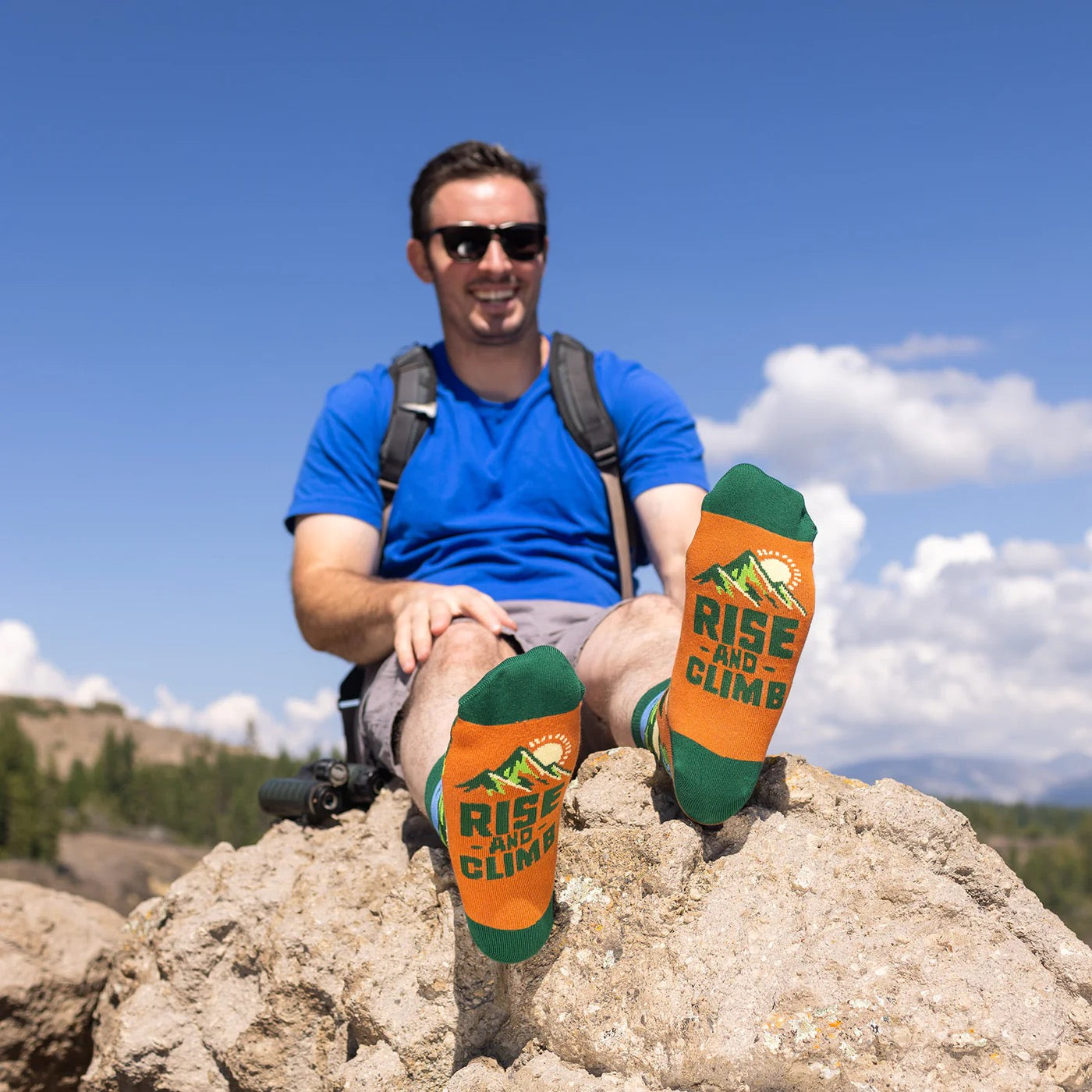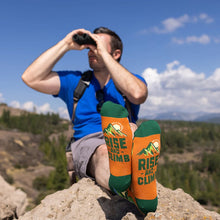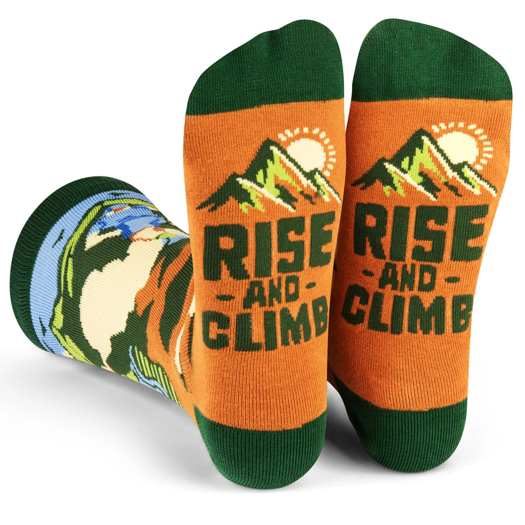These funny mountain themed socks make a great gift for hikers, mountain lovers and any outdoor enthusiast wanting to take their outdoor style to the next level. They'll love the ultra-soft and breathable feel of the cotton, keeping their feet comfy while on their next hiking or climbing adventure. Whether you’re conquering cliffs or just 'bouldering' through the day, these ‘Rise and Climb’ socks have got you covered!