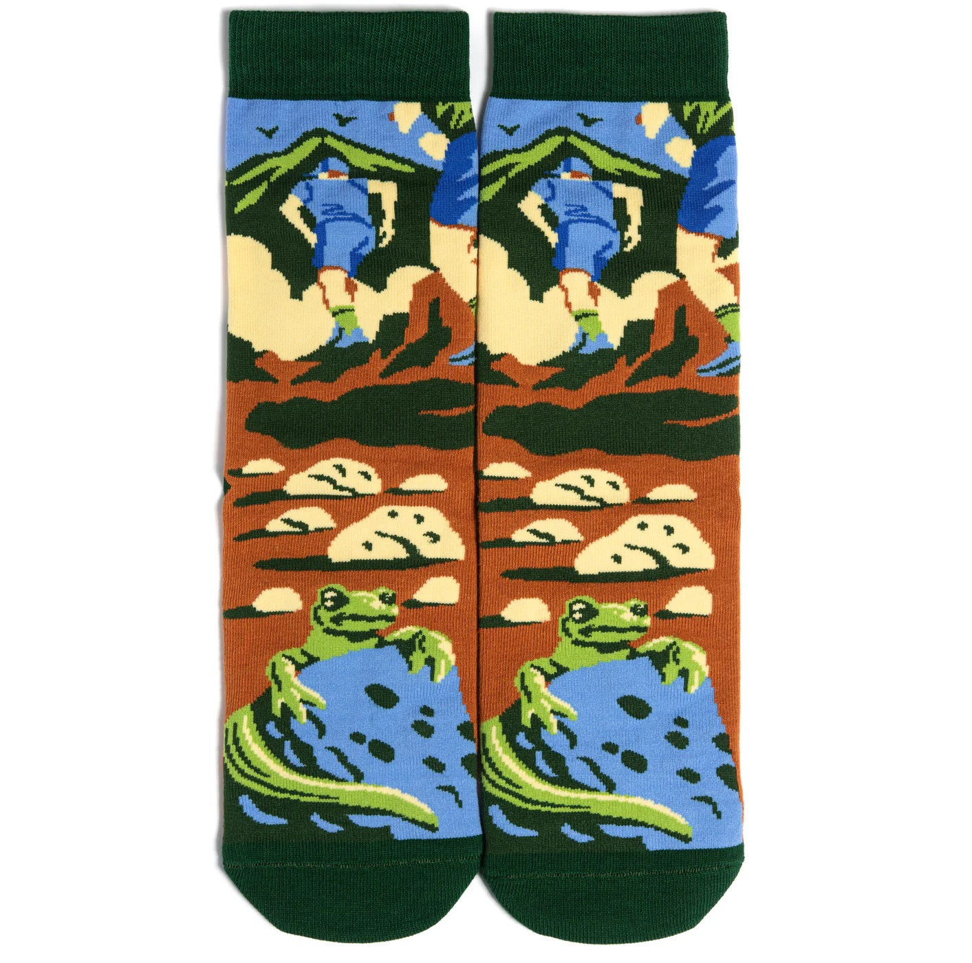 Hey there adventurous spirit! If you love to hike, we’ve got the sock for you…introducing our ‘Rise and Climb’ socks! Featuring a lush green palette that’s as vibrant as your climbing ambitions, and a hiker climbing to the summit with a lizard perched on a rock in the foreground, these socks will make you say, “Iguana be a part of that!” So grab a pair today and elevate your sock game!