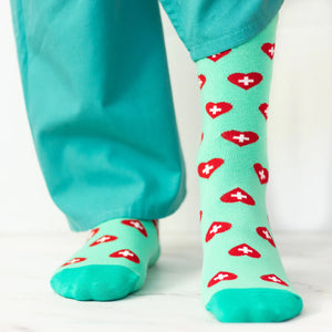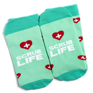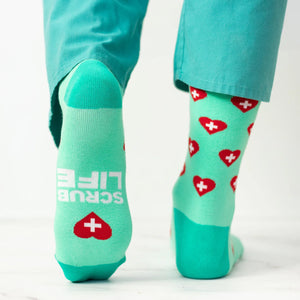 These fun socks are a great way to add some personality to the standard scrub uniform worn by nurses, doctors and other medical workers. They get amazing reactions and big laughs. The trendy design features a pattern of red hearts with white medical crosses, along with a funny secret message on the bottom: “SCRUB LIFE”. It's a great gift for any doctor, RN, nurse, surgeon, medical student or nursing school graduate.