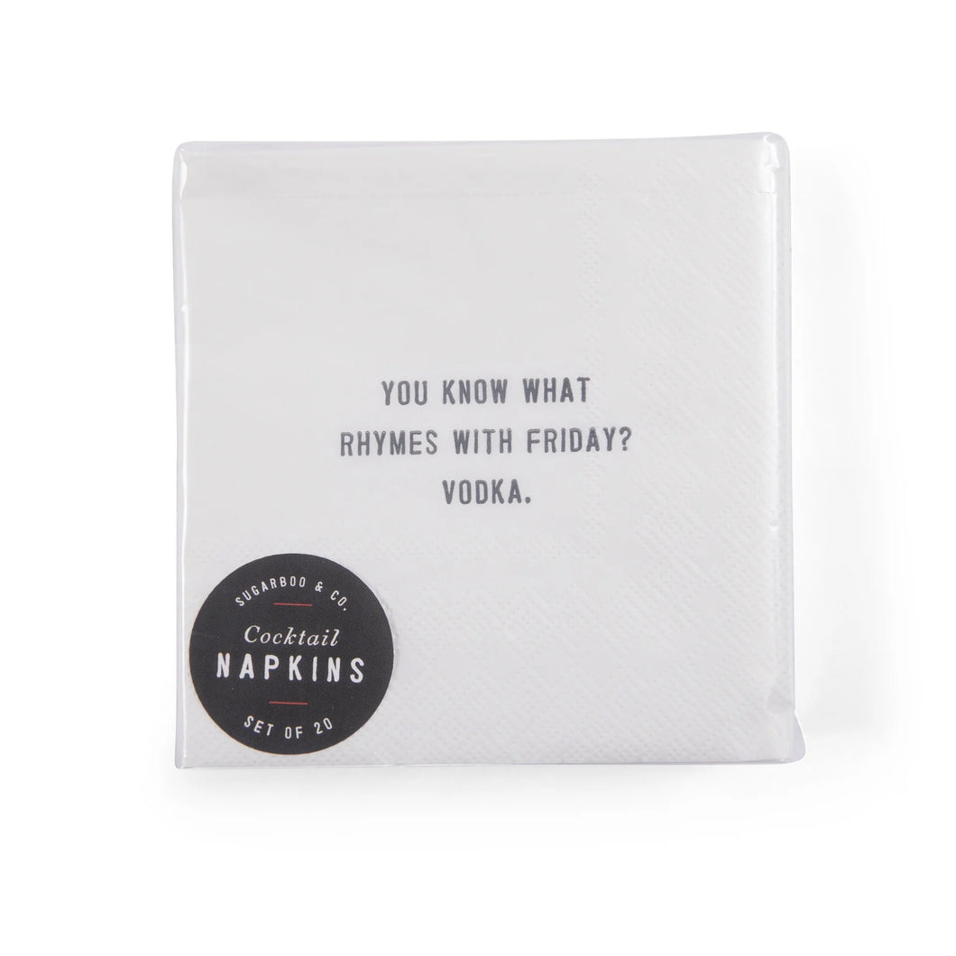 {"id":7278879866983,"title":"You Know What Rhymes With Friday? Vodka. Cocktail Napkins","handle":"you-know-what-rhymes-with-friday-vodka-cocktail-napkins","description":"\u003cdiv id=\"accordion-content-description\" aria-hidden=\"false\" class=\"accordion__content fs-body-100 rte non-page-rte measure\"\u003e\n\u003cp\u003e\u003cspan\u003eWhether it's a casual get-together, a themed cocktail party, or a special celebration, these napkins complement any occasion where good humor and great drinks are on the menu. \u003c\/span\u003e\u003cspan\u003eEach package of 20 cocktail napkins contains one quote and will add a fun and witty touch while entertaining.\u003c\/span\u003e\u003c\/p\u003e\n\u003cp\u003e\u003cspan\u003eSize: 5\" x 5\"\u003c\/span\u003e\u003c\/p\u003e\n\u003cp\u003e\u003cspan\u003eQuote: \"You know what rhyms with Friday? Vodka.\"\u003c\/span\u003e\u003c\/p\u003e\n\u003c\/div\u003e","published_at":"2025-05-23T16:43:55-05:00","created_at":"2025-05-21T12:41:43-05:00","vendor":"Sugarboo","type":"Cocktail Napkin","tags":["Bar","Kitchen"],"price":750,"price_min":750,"price_max":750,"available":false,"price_varies":false,"compare_at_price":null,"compare_at_price_min":0,"compare_at_price_max":0,"compare_at_price_varies":false,"variants":[{"id":41377807761511,"title":"Default Title","option1":"Default Title","option2":null,"option3":null,"sku":"BW102","requires_shipping":true,"taxable":true,"featured_image":null,"available":false,"name":"You Know What Rhymes With Friday? Vodka. Cocktail Napkins","public_title":null,"options":["Default Title"],"price":750,"weight":142,"compare_at_price":null,"inventory_management":"shopify","barcode":"10210086","requires_selling_plan":false,"selling_plan_allocations":[]}],"images":["\/\/indieindiebangbang.com\/cdn\/shop\/files\/Image236_34888881-39a2-48f9-9a69-c4d3ec0e7db5.jpg?v=1747849346"],"featured_image":"\/\/indieindiebangbang.com\/cdn\/shop\/files\/Image236_34888881-39a2-48f9-9a69-c4d3ec0e7db5.jpg?v=1747849346","options":["Title"],"media":[{"alt":"You Know What Rhymes With Friday? Vodka. Cocktail Napkins - Indie Indie Bang! Bang!","id":26474634215527,"position":1,"preview_image":{"aspect_ratio":1.0,"height":1920,"width":1920,"src":"\/\/indieindiebangbang.com\/cdn\/shop\/files\/Image236_34888881-39a2-48f9-9a69-c4d3ec0e7db5.jpg?v=1747849346"},"aspect_ratio":1.0,"height":1920,"media_type":"image","src":"\/\/indieindiebangbang.com\/cdn\/shop\/files\/Image236_34888881-39a2-48f9-9a69-c4d3ec0e7db5.jpg?v=1747849346","width":1920}],"requires_selling_plan":false,"selling_plan_groups":[],"content":"\u003cdiv id=\"accordion-content-description\" aria-hidden=\"false\" class=\"accordion__content fs-body-100 rte non-page-rte measure\"\u003e\n\u003cp\u003e\u003cspan\u003eWhether it's a casual get-together, a themed cocktail party, or a special celebration, these napkins complement any occasion where good humor and great drinks are on the menu. \u003c\/span\u003e\u003cspan\u003eEach package of 20 cocktail napkins contains one quote and will add a fun and witty touch while entertaining.\u003c\/span\u003e\u003c\/p\u003e\n\u003cp\u003e\u003cspan\u003eSize: 5\" x 5\"\u003c\/span\u003e\u003c\/p\u003e\n\u003cp\u003e\u003cspan\u003eQuote: \"You know what rhyms with Friday? Vodka.\"\u003c\/span\u003e\u003c\/p\u003e\n\u003c\/div\u003e"}